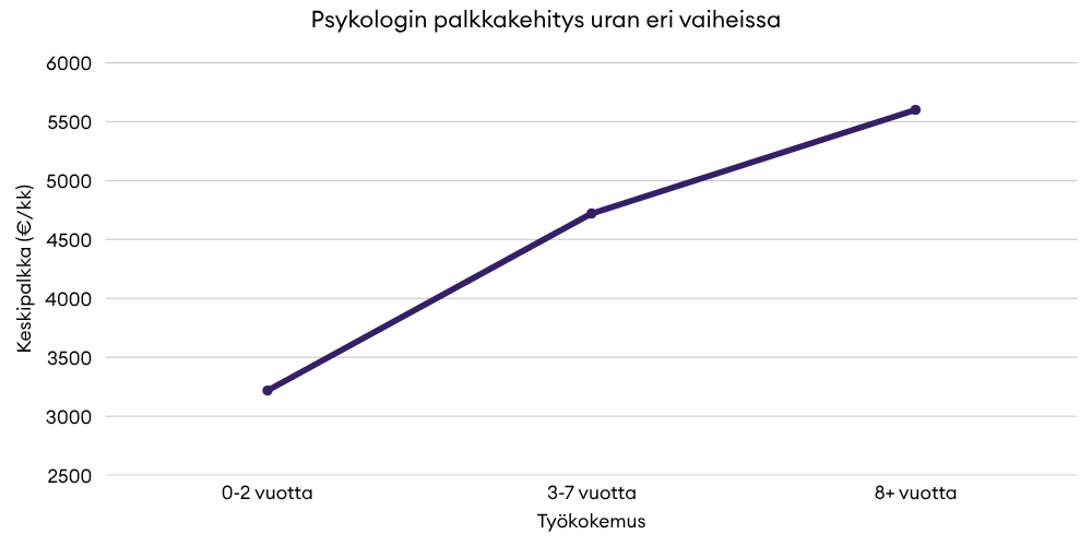 Työkokemus vaikuttaa voimakkaasti: uransa alussa (0–2 vuotta) koulupsykologi ansaitsee noin 3 218 €/kk, kun taas yli kahdeksan vuoden kokemuksella ansio voi nousta 5 578 €/kk.
